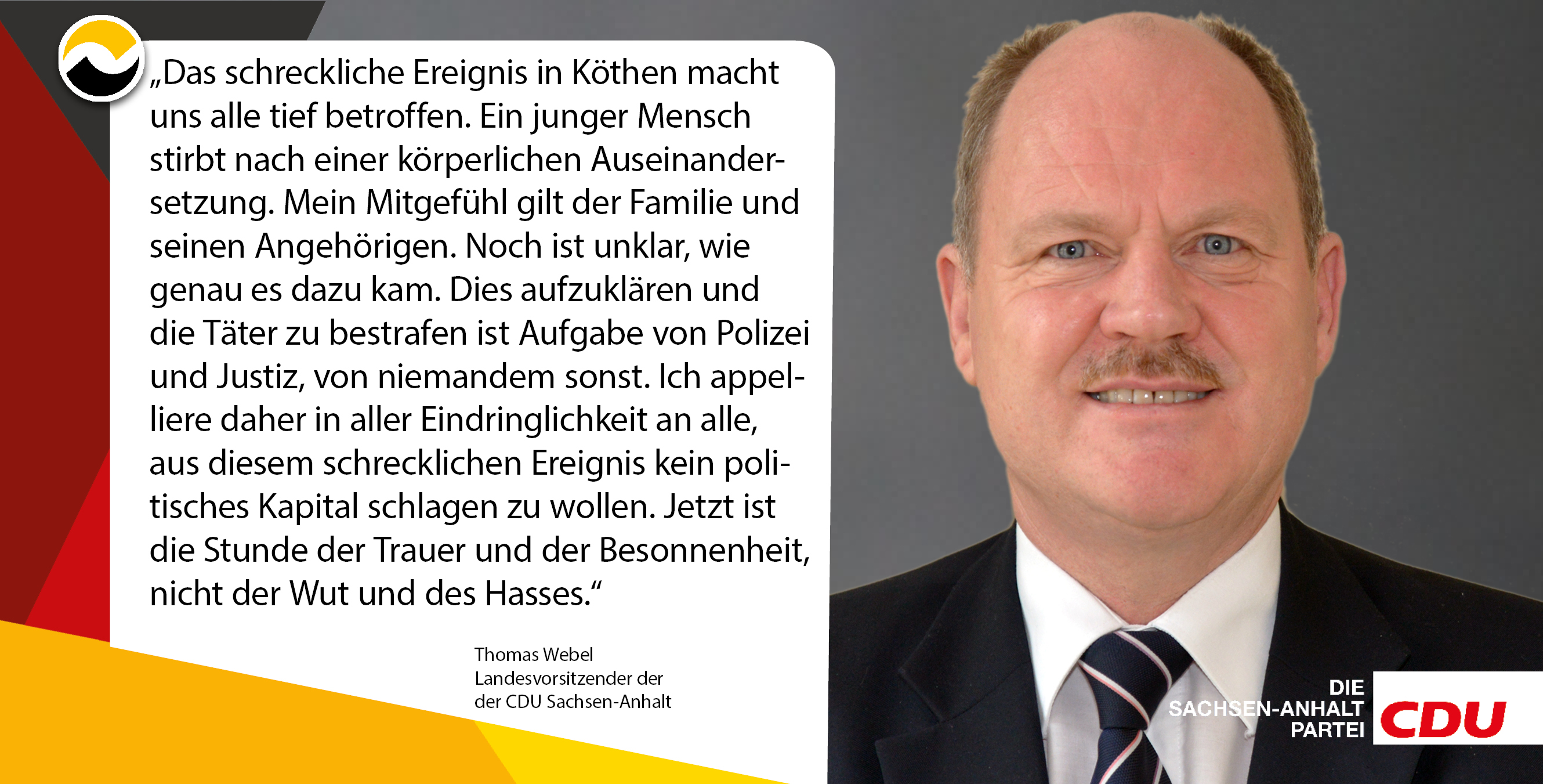 "Das schreckliche Ereignis in Köthen macht uns alle tief betroffen. Ein junger Mensch stirbt nach einer körperlichen Auseinandersetzung. Mein Mitgefühl gilt der Familie und seinen Angehörigen. Noch ist unklar, wie genau es dazu kam. Dies aufzuklären und die Täter zu bestrafen ist Aufgabe von Polizei und Justiz, von niemandem sonst.