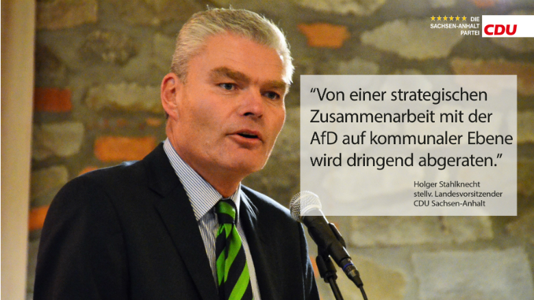 In Anlehnung an die aktuelle Diskussion und Berichterstattung zur möglichen Zusammenarbeit der CDU mit der AfD betont der stellv. Landesvorsitzender der CDU Sachsen-Anhalt, Holger Stahlknecht MdL, für die CDU Sachsen-Anhalt deutlich, dass es jetzt und auch nach 2021 auf Landesebene keine Koalition mit der AfD geben wird. Auch auf kommunaler Ebene wird von einer strategischen Zusammenarbeit mit der AfD dringend abgeraten.